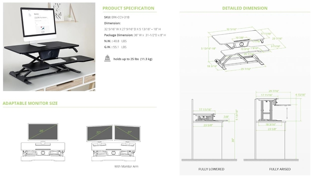 | Positives | Great value, silent lift mechanism (as opposed to models that make loud latching noises), space-saving X-Lift design, infinite height stops in its range, unique buffering system for smoothly lowering unit, solid height range, monitor arm compatible (with a minor caveat), deep work surface is better for viewing a larger monitor or dual monitors. |